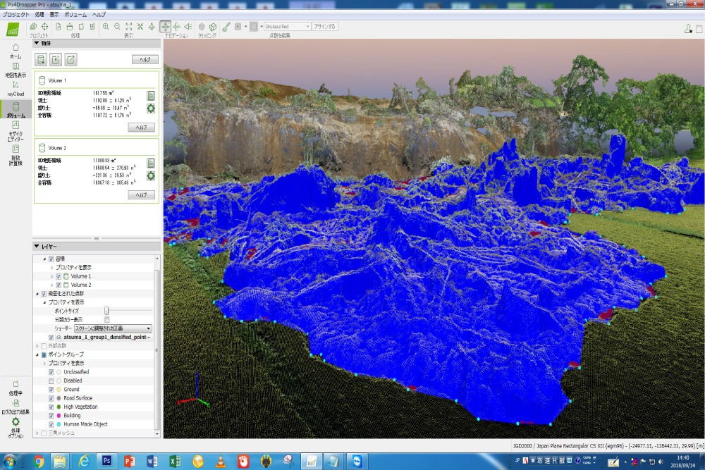 | 災害対応関連業務 | 災害箇所(河川氾濫・土砂崩れ等)空撮・オルソ化 ⇒ 三次元処理・解析 ⇒ 被害面積・土砂量等算出・図化 |