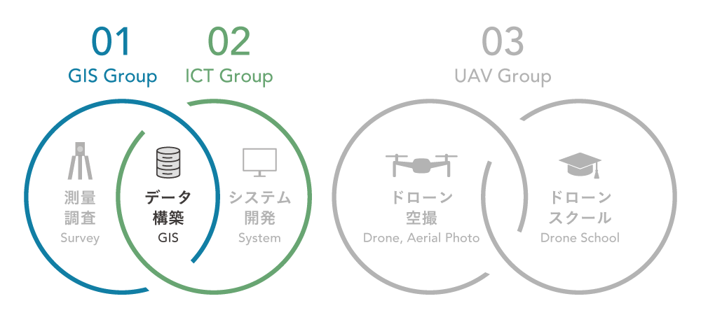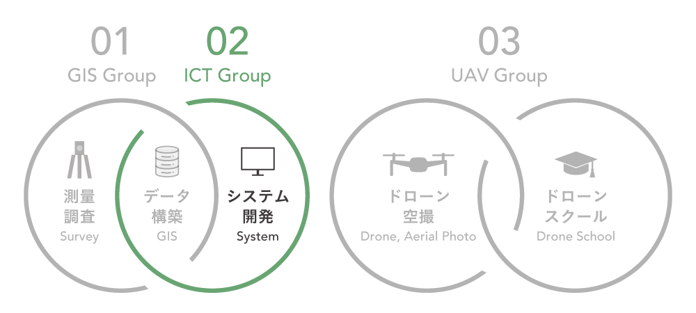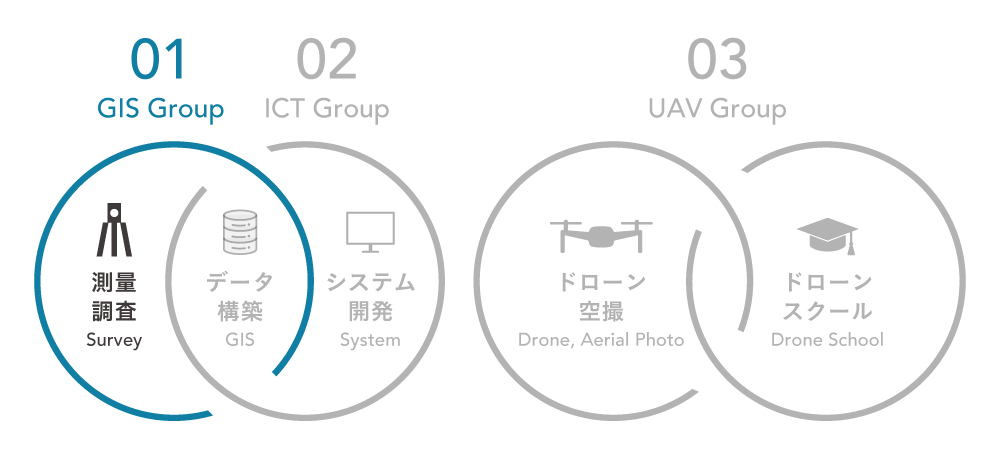GIS(地理情報システム – Geographic Information System)は、当グループの「GIS」と「システム開発」の中間に位置し、部門間のパイプライン的な役割を果たしながら、様々な各種GISデータ作成・構築業務を行っており、お客様に満足頂けるよう日々技術を磨きながら精度・鮮度の高い地図情報を提供しております。
