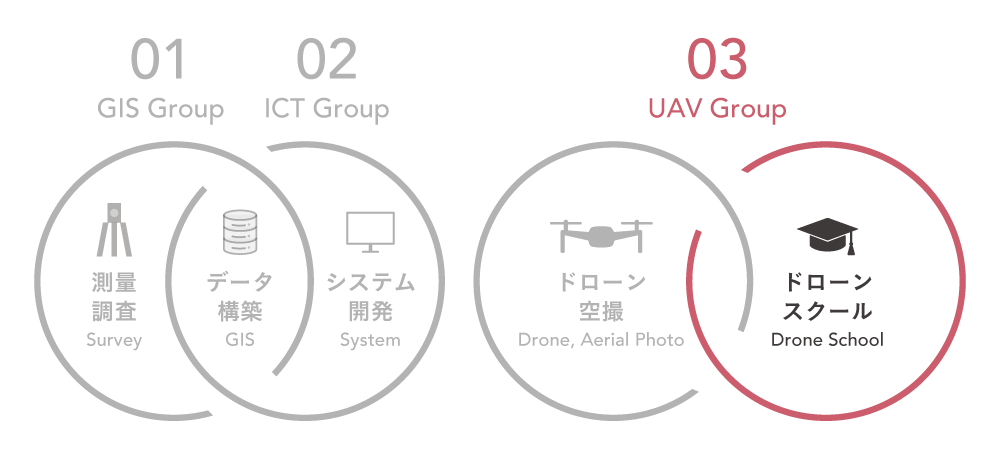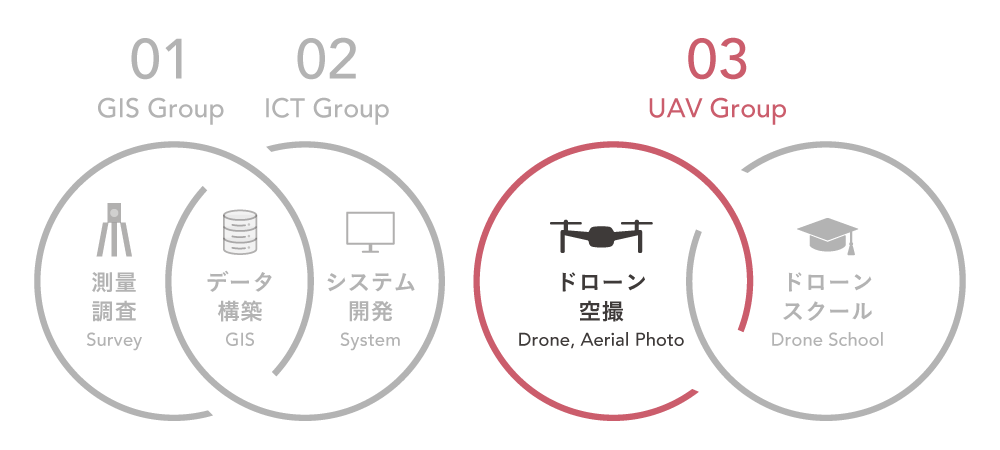 | i-Construction関連業務(土木・農業) | 現場空撮・ オルソ化 ⇒ 三次元処理 ⇒ 解析・図化もしくは空撮関連データ協力業者提供 |