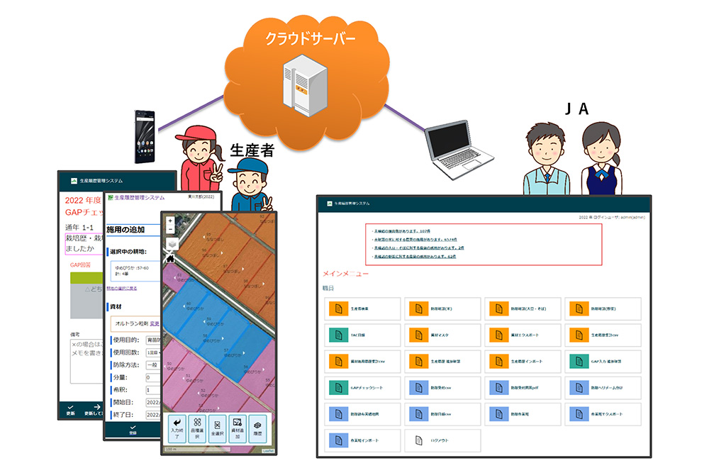 | 営農情報管理システム(J-Map) | 農業協同組合様・農業共済組合様・行政機関(農政課)様向けの業務支援システム |